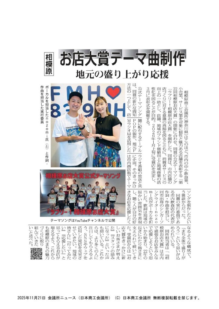 相模原お店大賞のテーマソング制作を、 日本商工会議所の会議所ニュース(11/21号)に取り上げて頂きました。この機会に実行委員の佐藤章伸さんが作詞作曲、nozomiさんが歌う「ラブリー!相模原お店大賞」をぜひ聴いてみて下さい!