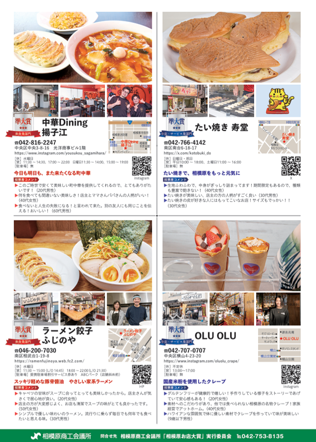 第22回相模原お店大賞の受賞店チラシが完成しました。 皆様に応援して頂いた第22回相模原お店大賞受賞店の受賞記念チラシが完成しました。今回も魅力溢れるお店が出揃いましたので、ぜひ、一度行ってみて下さい! チラシデータのダウンロードはコチラより ◀ 1つ前の記事 一覧に戻る 一覧に戻る